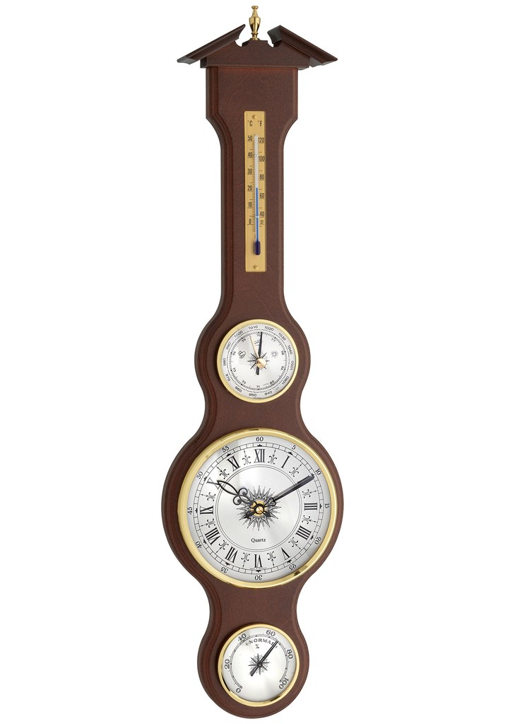 Meteostanice obsahuje barometr (průměr 70 mm), analogové hodiny (průměr 135 mm), vlhkoměr (průměr 70 mm) a kapalinový teploměr. Podložka je dřevěná v barvě ořechového dřeva.