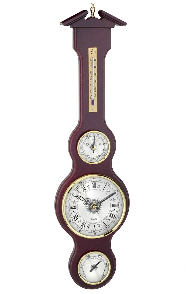 Meteostanice obsahuje barometr (průměr 70 mm), analogové hodiny (průměr 135 mm), vlhkoměr (průměr 70 mm) a kapalinový teploměr. Podložka je dřevěná v barvě mahagonu.