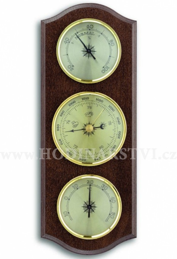 Meteostanice obsahuje barometr, vlhkoměr a teploměr - přístroje jsou o průměru 70 mm (teploměr, vlhkoměr) a 81 mm (barometr). Podložka je buková mořena do odstínu ořechu.