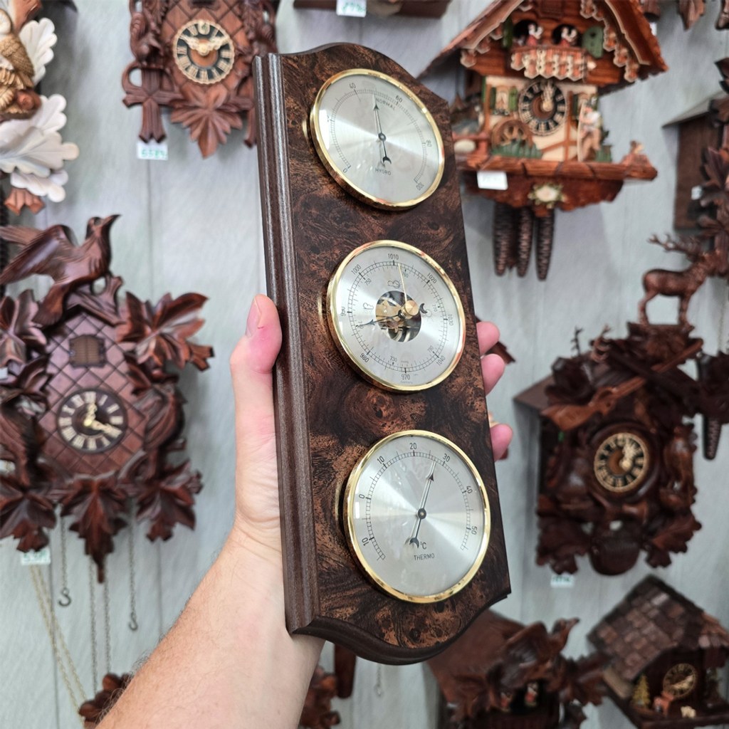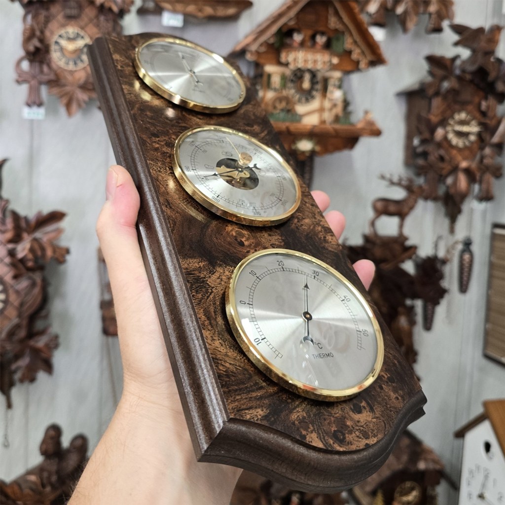 Meteostanice obsahuje barometr, vlhkoměr a teploměr - všechny přístroje jsou o průměru 93 mm. Podložka je buková mořena do speciálního odstínu kořenového ořechu.