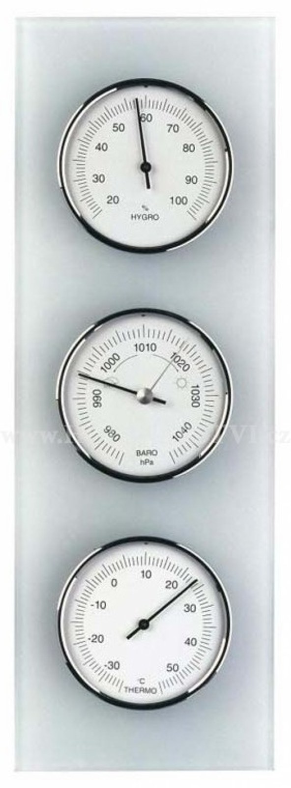 Meteostanice obsahuje barometr, vlhkoměr a teploměr - přístroje jsou o průměru 81 mm. Podložka je z matného skla.
