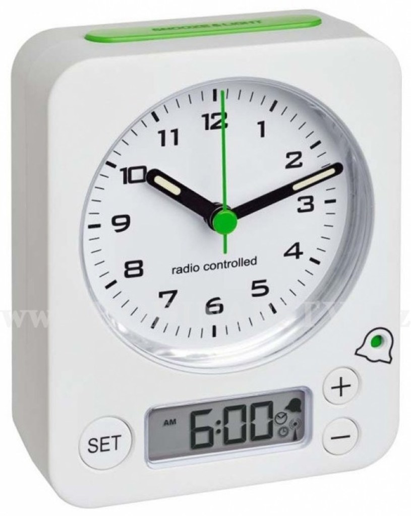 Pokud sháníte velký a jednoduše čitelný budík, pak je pro vás maxi-alarm TFA 60.1511.01.05 s analogovými hodinami a digitálním minidisplejem pro čas buzení ideální volbou. Rádiový signál DCF za vás vyřeší nastavení přesného času i přechod ze zimního na letní čas a naopak. Jeho masivní tělo pak odolá i nějaké té drobné havárii při ranním vstávání. Jde prostě o skvělého parťáka, se kterým už ráno nezaspíte! Funkce a vlastnosti