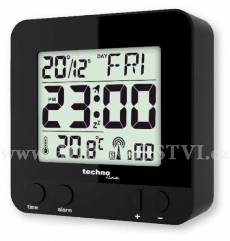 - displej o rozměrech 53 x 44 mm - velikost číslic čas 17 mm, datum, zkratka názvu dne, teplota 9 mm - možnost krátkodobého podsvícení displeje na 5 sekund modrým světlem - čas řízený rádiovým signálem DCF-77 s možností manuálního nastavení - ikona příjmu signálu DCF-77 - 12/24 hodinový formát - budík s opakovaným buzením po 5 minutách - buzení zvukovým signálem (10 sekund 1 pípnutí za sekundu, 10 sekund 2 pípnutí za sekundu, 10 sekund 4 pípnutí za sekundu a poté stálé dvakrát 4 pípnutí za sekundu) - časová zóna (+12/-12 hodin) - datum, zkratka názvu dne (EN, FR, DE, ES, NL, IT, DK) - měření vnitřní teploty - napájení bateriemi 2 ks 1,5 V typ AAA (mikrotužkové) - rozměry 79 x 79 x 26 mm - barva černá
