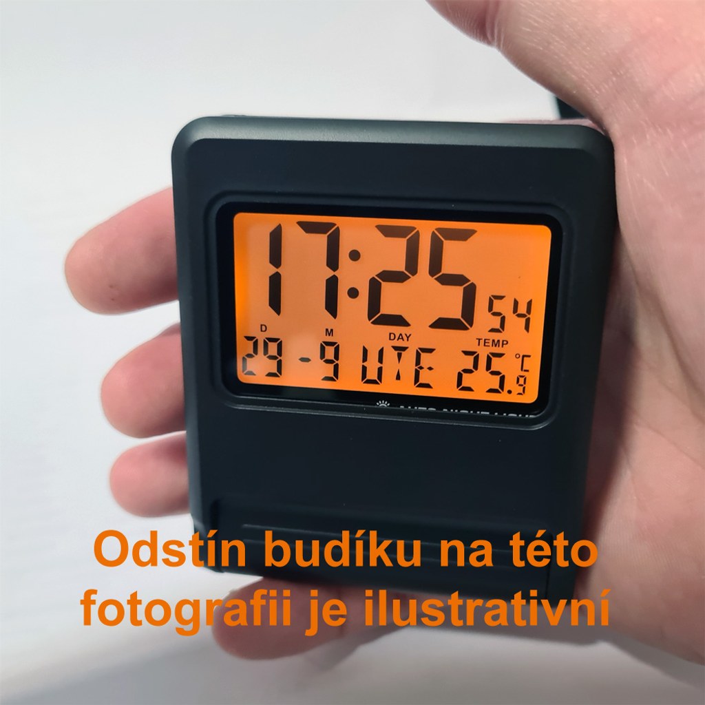 Tento digitální budík je také na vteřinu přesný díky automatickému seřízení rádiovým signálem z Německa. Je možné na něm nastavit buzení pípáním s postupným zesilováním a především, umí se automaticky podsvítit po setmění.