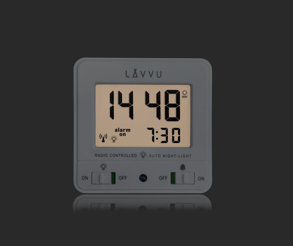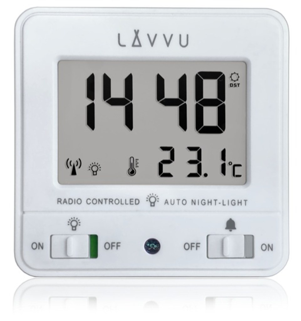 Praktický digitální budík LAVVU je automaticky řízen přesným rádiovým signálem z Německa. Navíc je vybaven světelným senzorem, díky kterému se může displej automaticky rozsvítit po setmění a snadno Vy tak i uprostřed noci přečtete, kolik je hodin. Budík také zobrazuje teplotu vzduchu v místnosti.