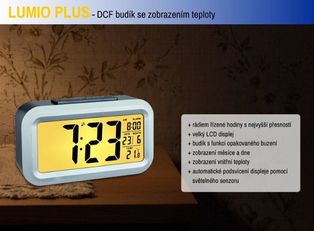 Digitální budík s velkou LCD obrazovkou a s funkcí zobrazení data, vnitřní teploty a možností trvalého osvětlení displeje. Budík je napájen pouze bateriemi a není třeba napájení ze sítě.