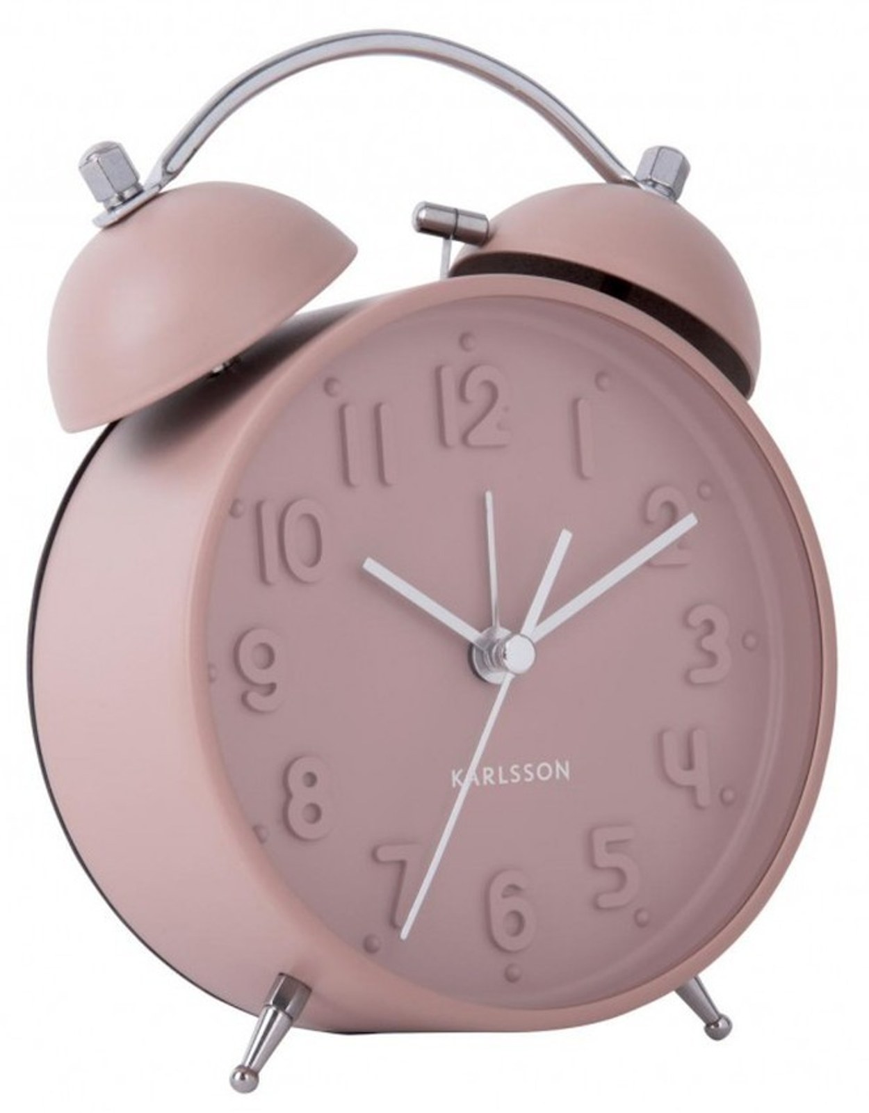 Designový budík v kovovém lakovaném matu s chromovanými doplňky.