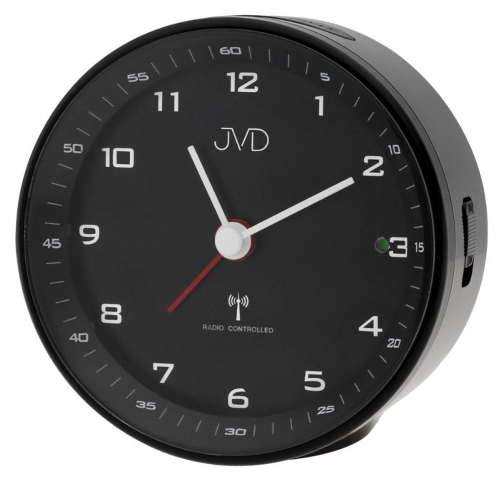 Ručičkový budík řízený rádiovým signálem JVD RB977 s jednoduchým ovládáním, bílým osvětlením číslic a indikací zapnutého budíku na ciferníku.