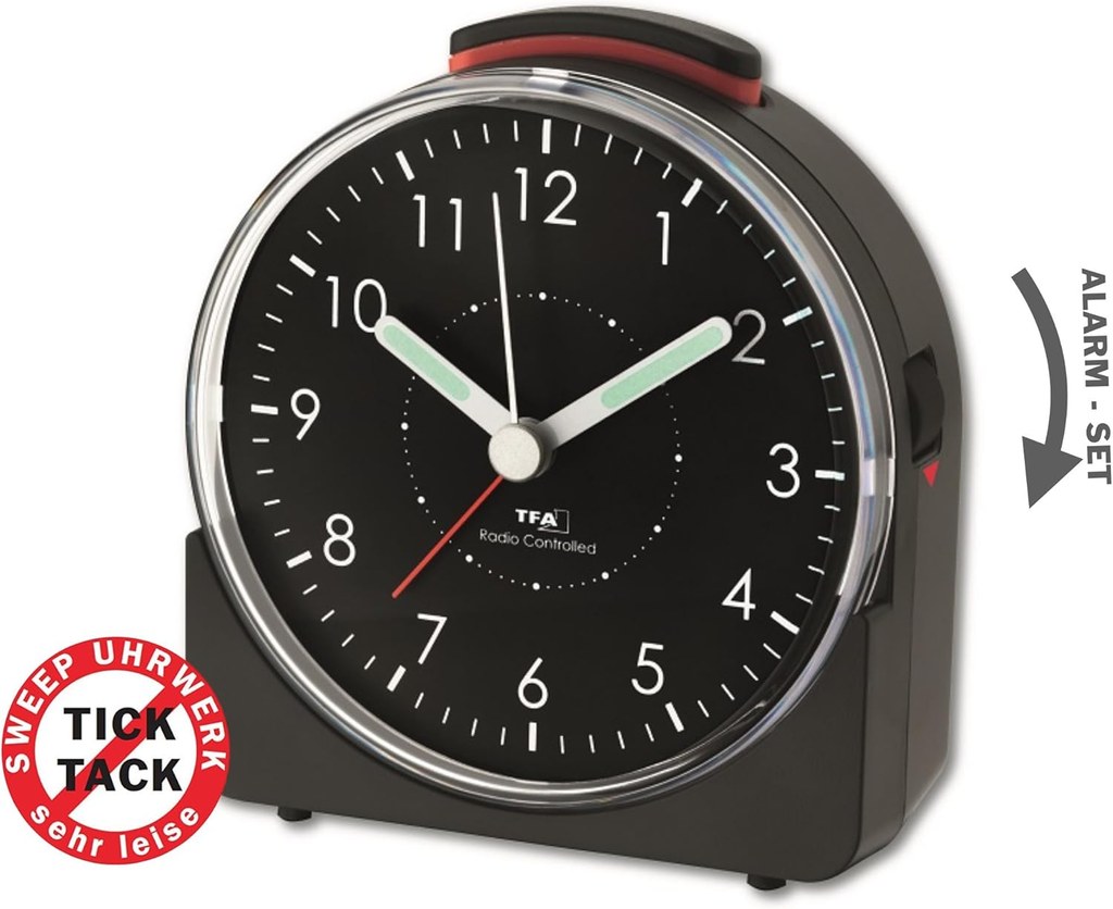 Analogový budík řízený DCF signálem TFA 60.1513.01 s funkcí opakovaného buzení "snooze" zaujme především velkým číselníkem v černé barvě. Budík má tzv. tichý chod a není tedy slyšet chod sekundové ručičky. Hodinová a minutová ručička jsou opatřeny fluorescenčním nátěrem. Uživatelé jistě ocení možnost krátkodobého osvětlení (cca 5 s) je-li budík nazdvihnut.