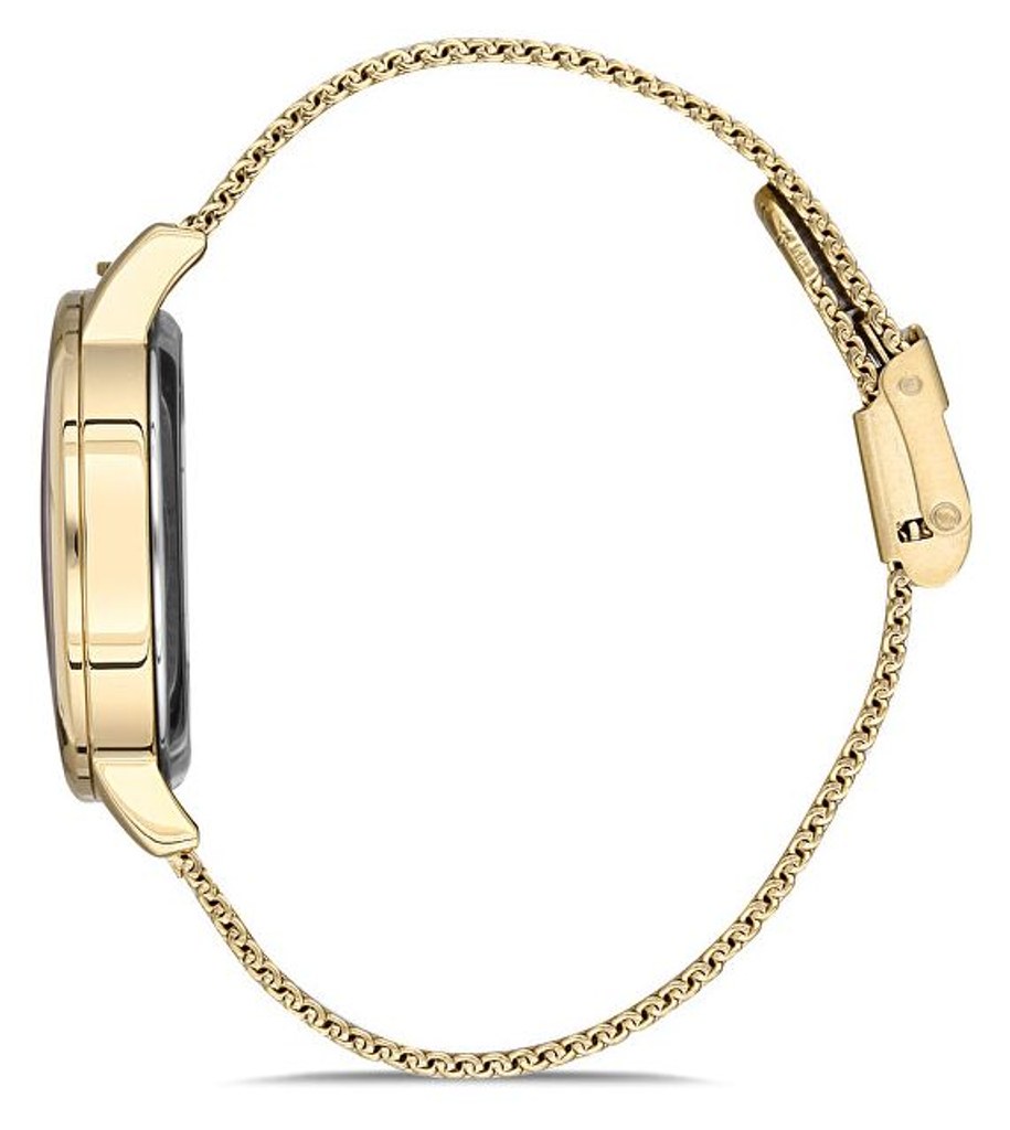 Parametry: - Pouzdro: kovové - zlacené - Náramek: ocelový - zlacený - Sklíčko: minerální - Vodotěsnost: 50M - 5ATM - možné činnosti: sprchování, déšť, stříkající voda - Pohon: quartzový strojek je elektricky napájen vyměnitelnou baterií Rozměry: - Pouzdro: průměr 36 mm