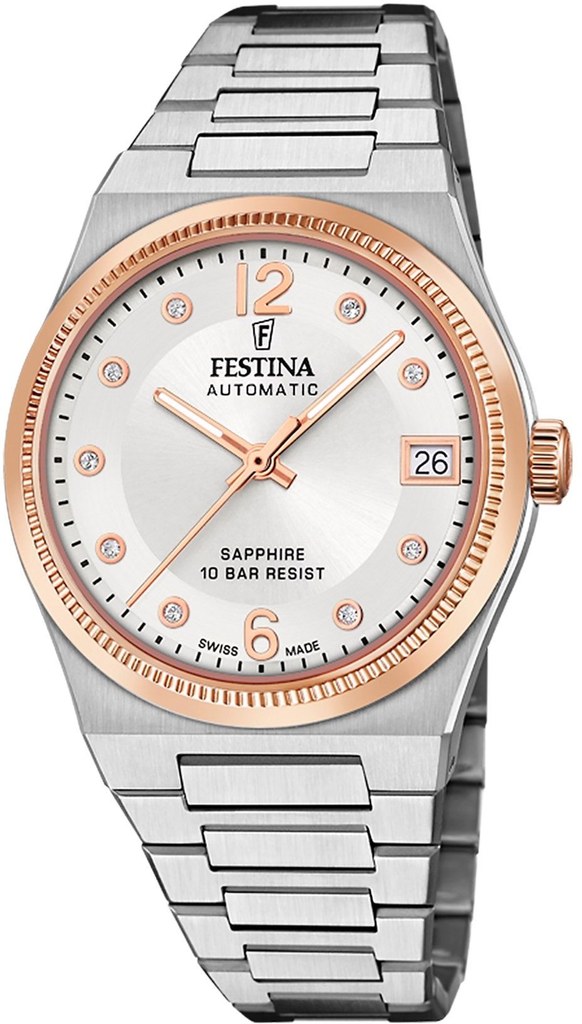 Klasické dámské hodinky s automatickým nátahem a ocelovým náramkem zaujmou stříbrným číselníkem se zirkony, který lemuje luneta v barvě růžového zlata. Disponují vodotěsností 100 metrů, safírovým sklem a datumovkou.