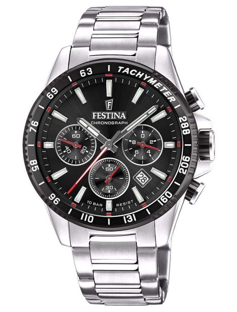 Pánské sportovní hodinky s chronografem na ocelovém tahu. Díky vodotěsností 10 ATM se můžete s hodinkami potápět bez dýchacího přístroje.