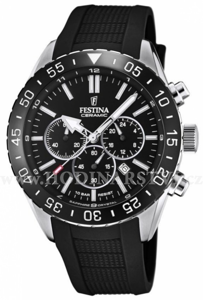 Sportovní hodinky pro muže s chronografem z kvalitní ušlechtilé oceli a keramiky, která má tu vlastnost, že se nepoškrábe. Díky plastovému řemínku, safírovému sklu a vodotěsnosti 10 ATM jsou vhodné na plavání. Kruhový číselník je doplněn jednoduchými segmenty a ručkami s luminescenční vrstvou.