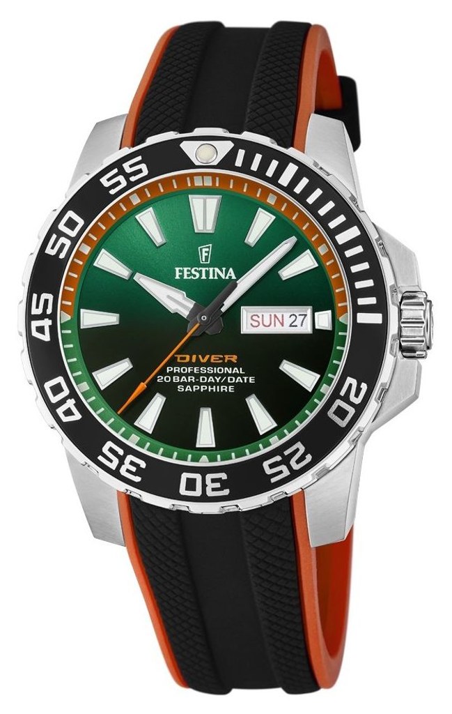 Pánské quartzové hodinky na kaučukovém řemínku disponují funkcí ukazatele data a dne v týdnu. Díky vodotěsnosti 20 ATM jsou vhodné pro potápění do hloubky 50 metrů. Zeleno-černý číselník je chráněn safírovým sklem.