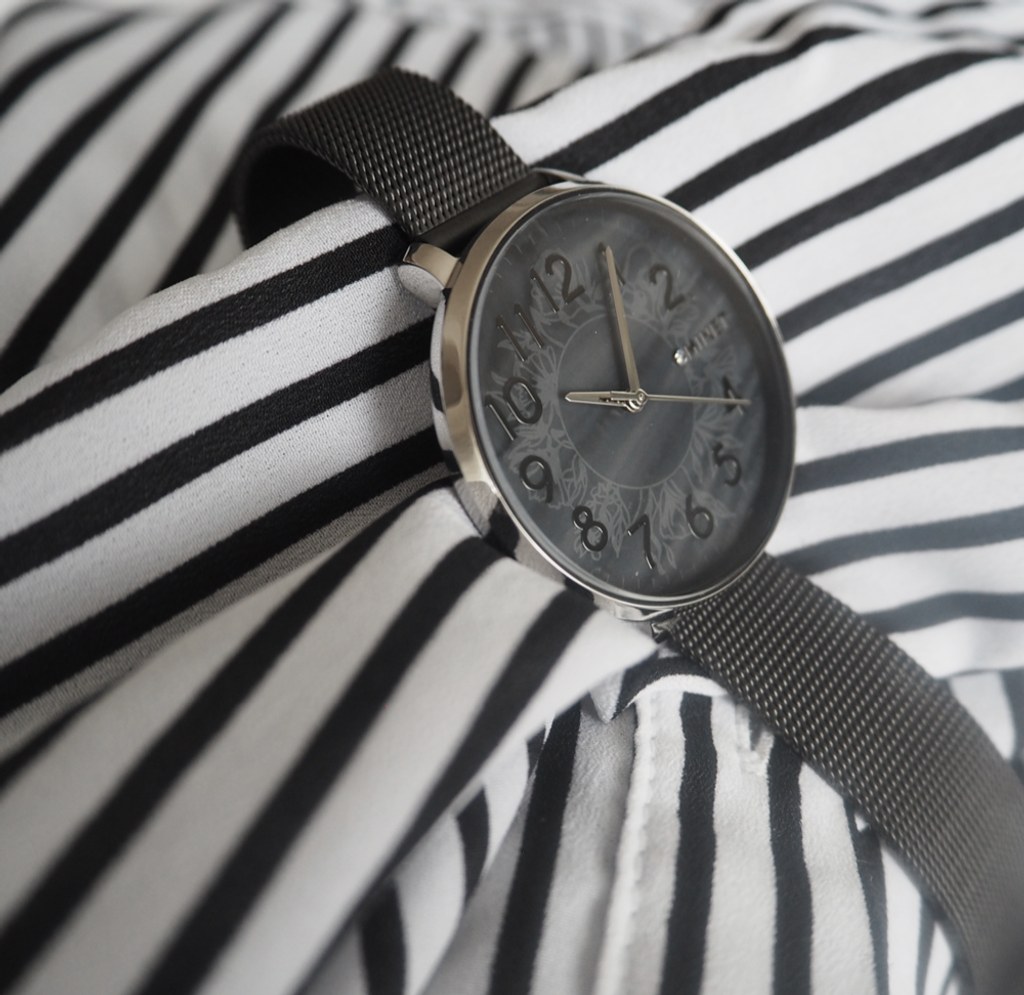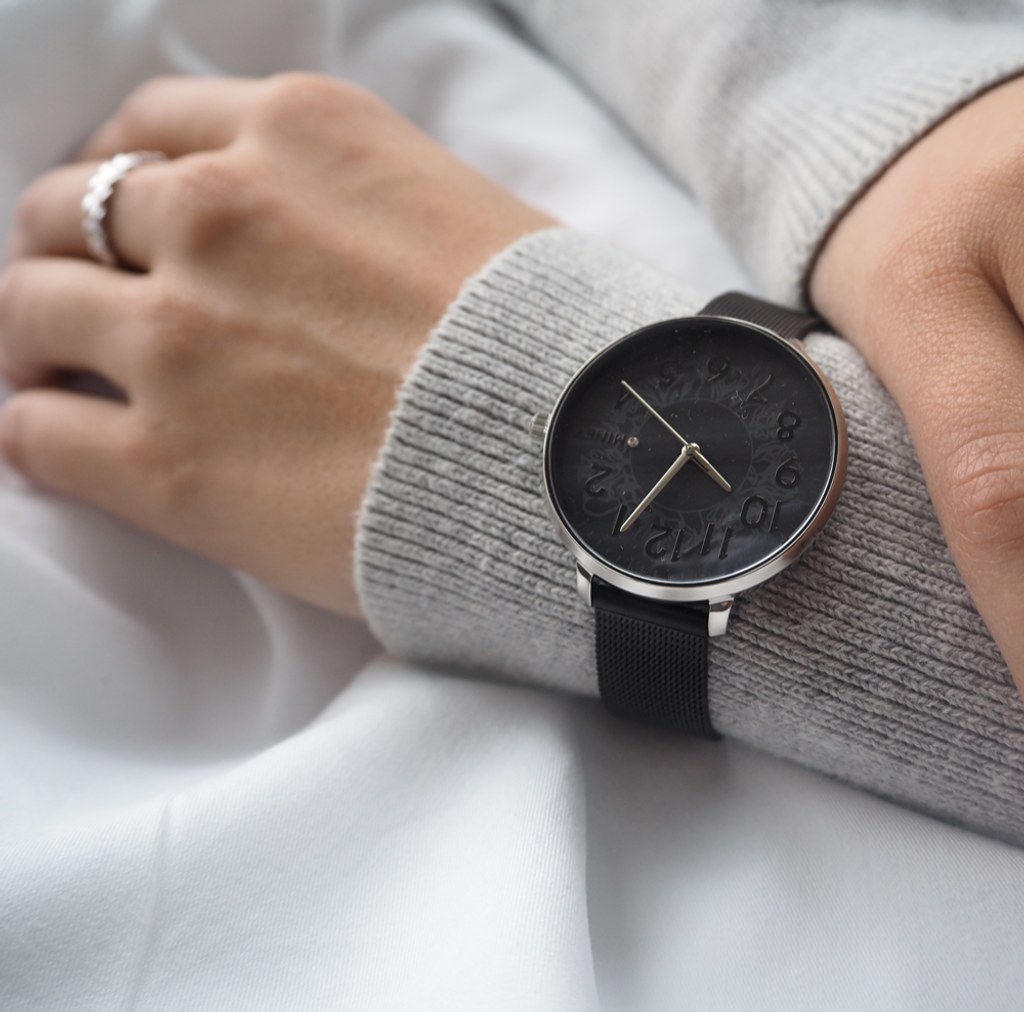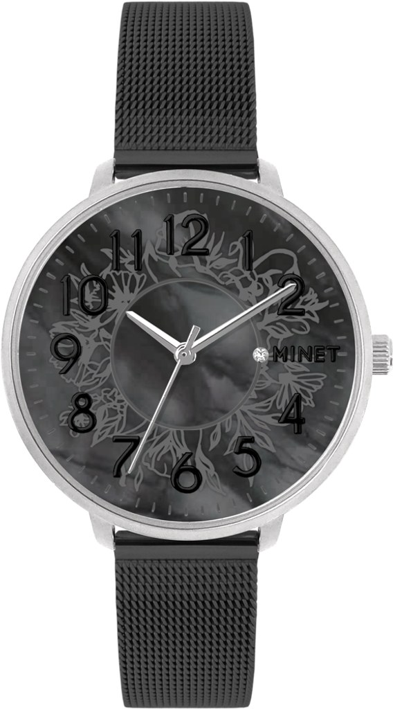 Elegantní hodinky české značky MINET s černým perleťovým číselníkem a černým moderním ocelovým řemínkem milánského typu. Vyměnitelný řemínek se snadným systémem zkracování se přizpůsobí obvodu ruky. Hodinky jsou vyrobeny z hypoalergenní nerezové oceli.