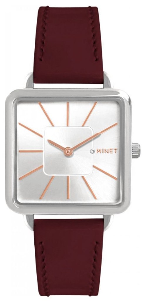 Elegantní hodinky české značky MINET se stříbrným číselníkem a moderním lakovaným vínovým páskem. Vyměnitelný řemínek z hladké hovězí španělské kůže TopGrain, která je označována za nejkvalitnější a nejodolnější kůži na světě. Hodinky jsou vyrobeny z hypoalergenní nerezové oceli.