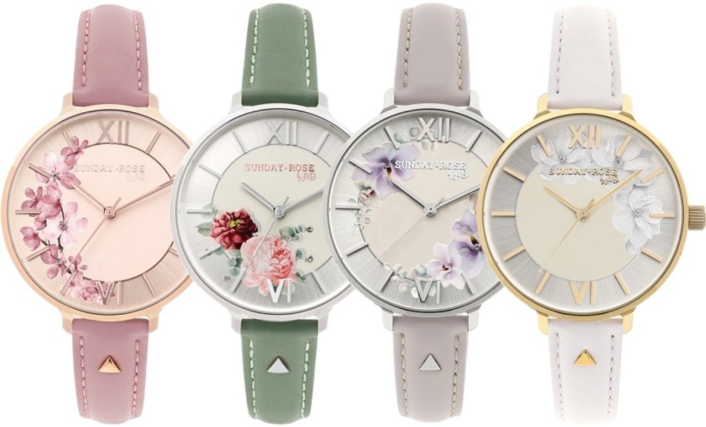 Hodinky Sunday Rose reprezentují ženskou eleganci, něžnost a styl. Jsou inspirovány přírodou a něžnými květinovými vzory, což hodinky výrazně odlišuje od běžných doplňků a dodává jim výjimečnost. Jejich design je tvořen na základě toho, co od hodinek dámy očekávají a při jejich tvorbě jsou sledovány nejnovější trendy. Výrobu těchto hodinek zaštiťuje oblíbená česká značka hodin a hodinek JVD.