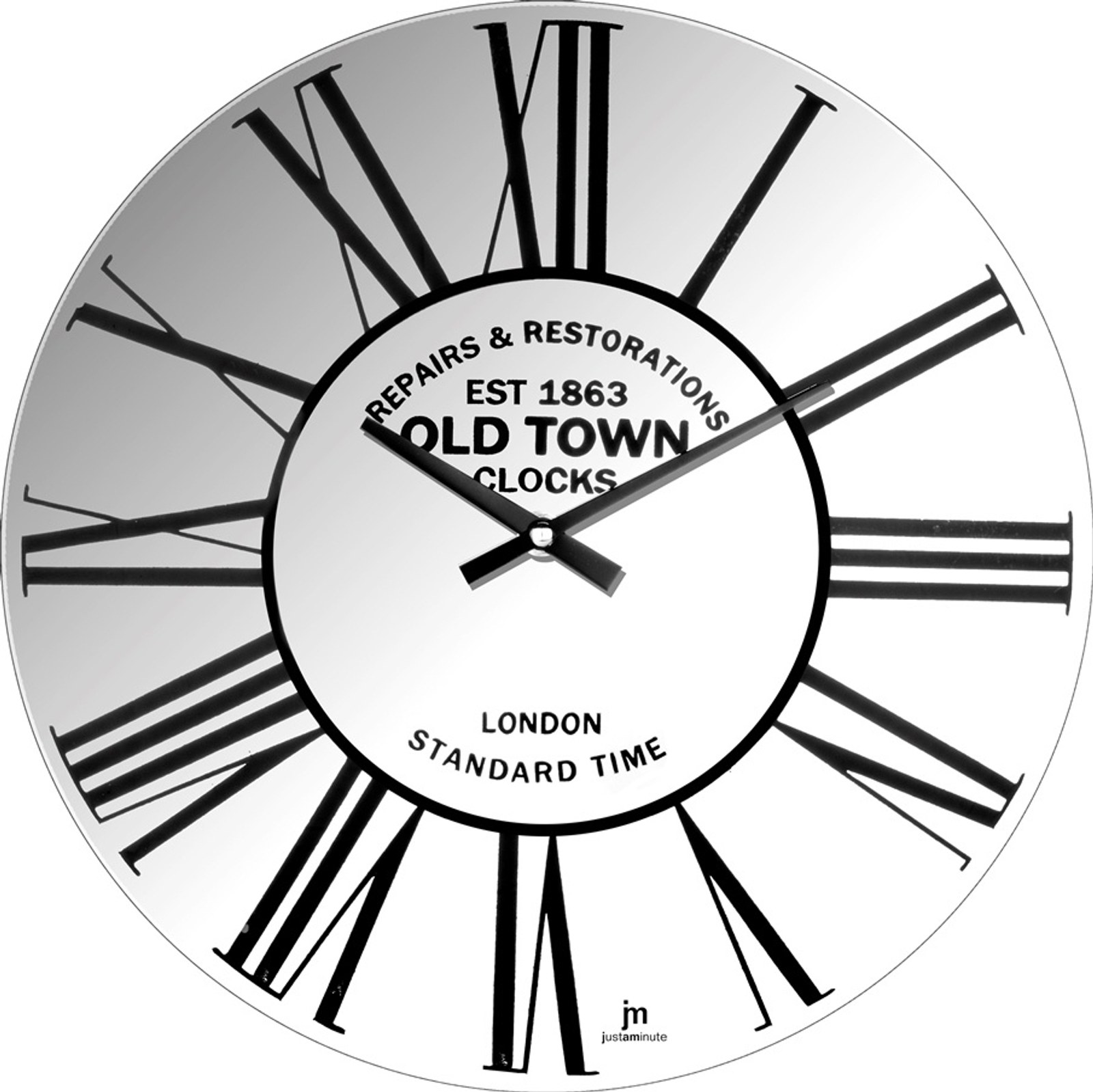 Nástěnné hodiny v populárním antik designu v zrcadlové verzi (pozadím).