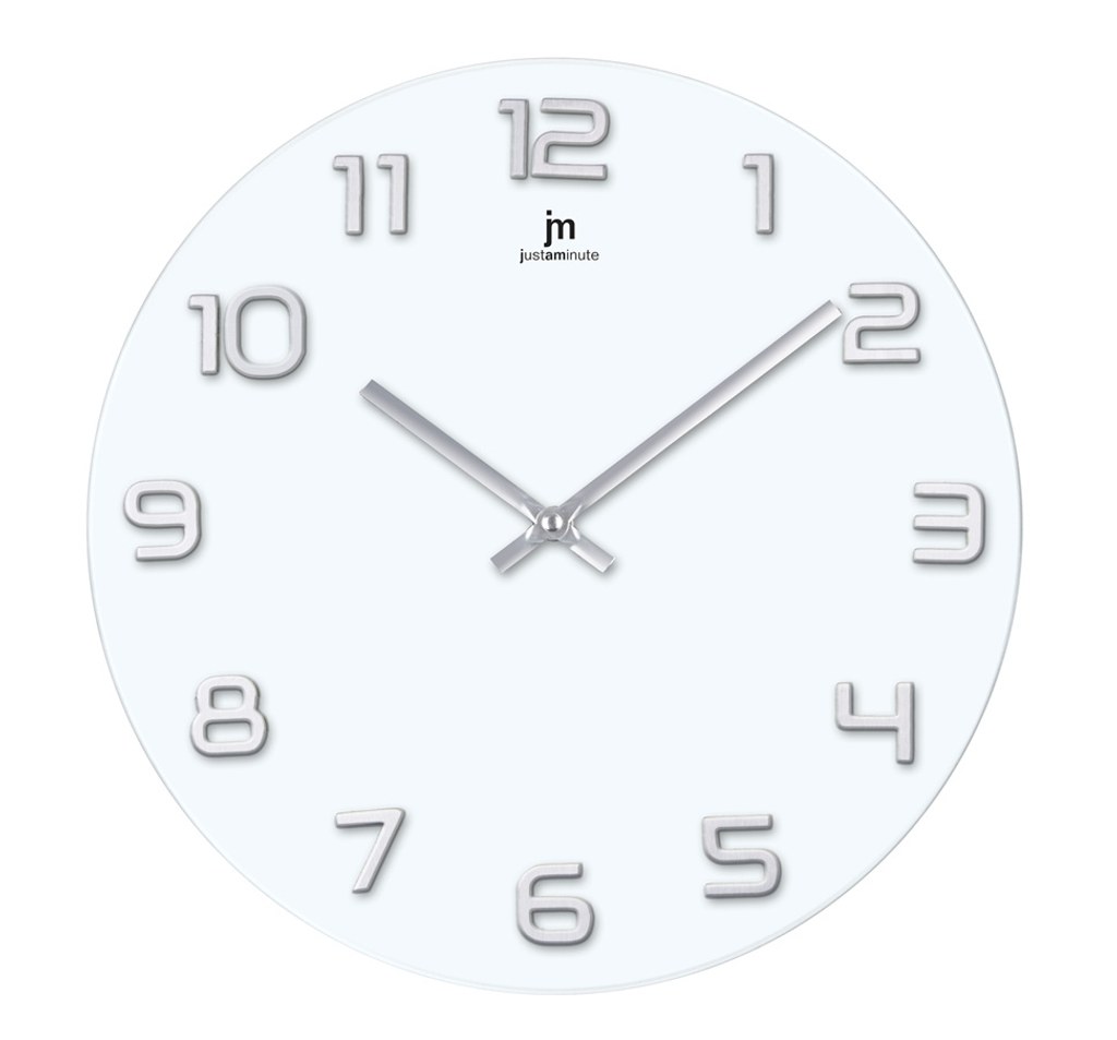 Ciferník v syté mléčné barvě s chromovanými embosovanými čísly a kovovými ručičkami.