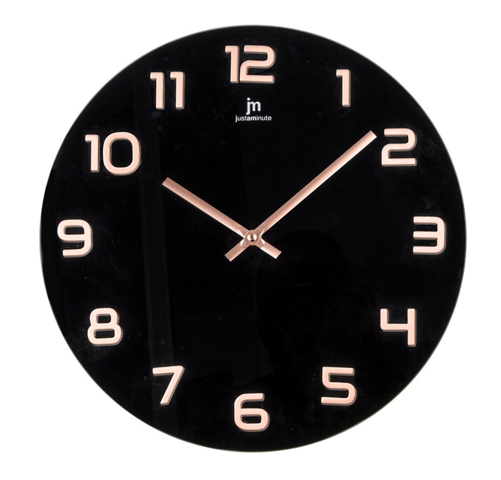 Ciferník v syté černé barvě s chromovanými embosovanými čísly a kovovými ručičkami.