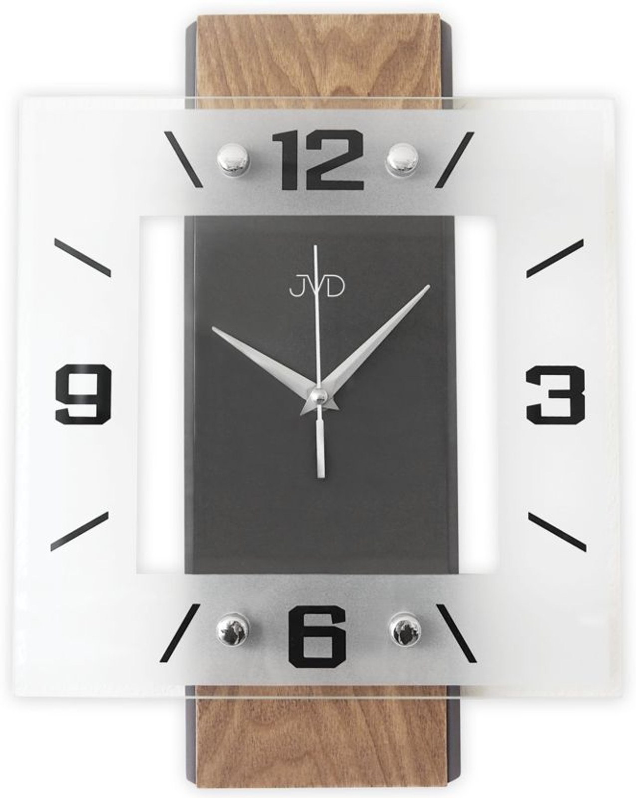 Moderní nástěnné hodiny od české značky JVD vyrobené z kvalitních materiálů jako je dřevo, kov a sklo.