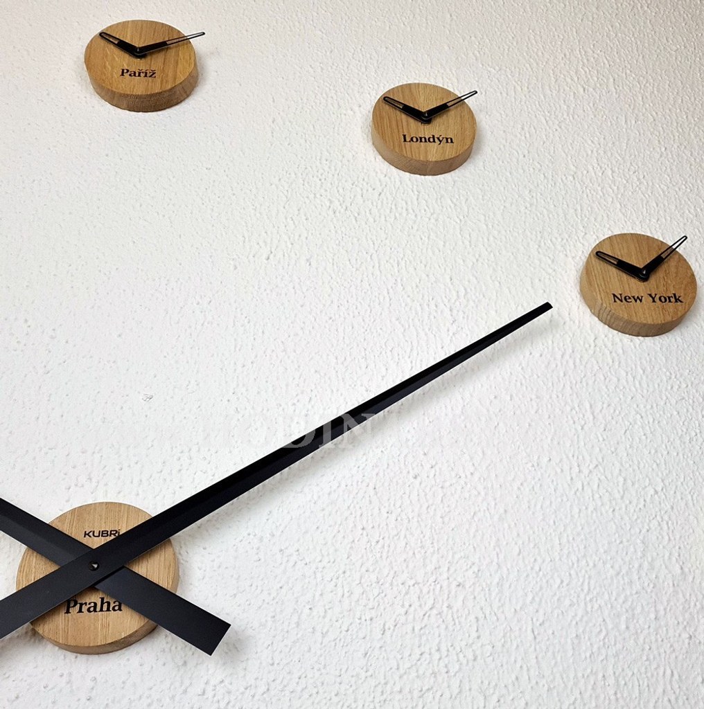 Materiál: dubové dřevo + kovové ručičky Bateriový pohon - 13x tužková baterie (AA) - není součástí Průměr celých hodin včetně strojků časových zón: 100 cm (tento rozměr je vyobrazen na fotu) - je možné nalepit dle své představy v rozmezí cca 90 - 130 cm Průměr středu hodin (strojku): 10 cm Průměr strojků časových zón: 10 cm