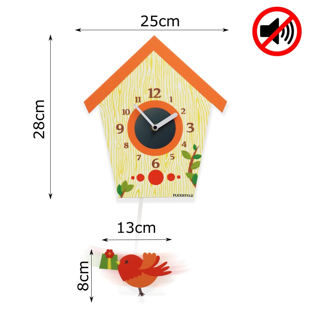 Materiál: akrylové sklo Rozměr hodin je uveden na fotce Pohon: bateriový (2x AA - tužková) Pohyblivé kyvadlo - ptáček Tichý chod