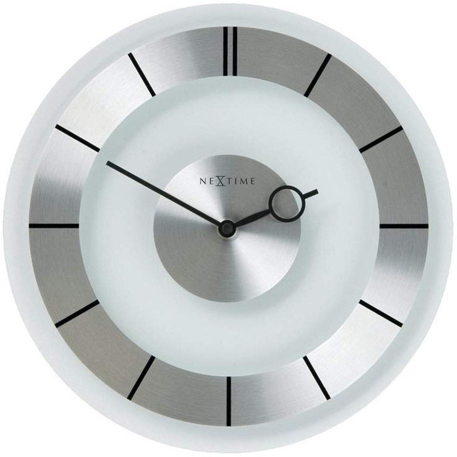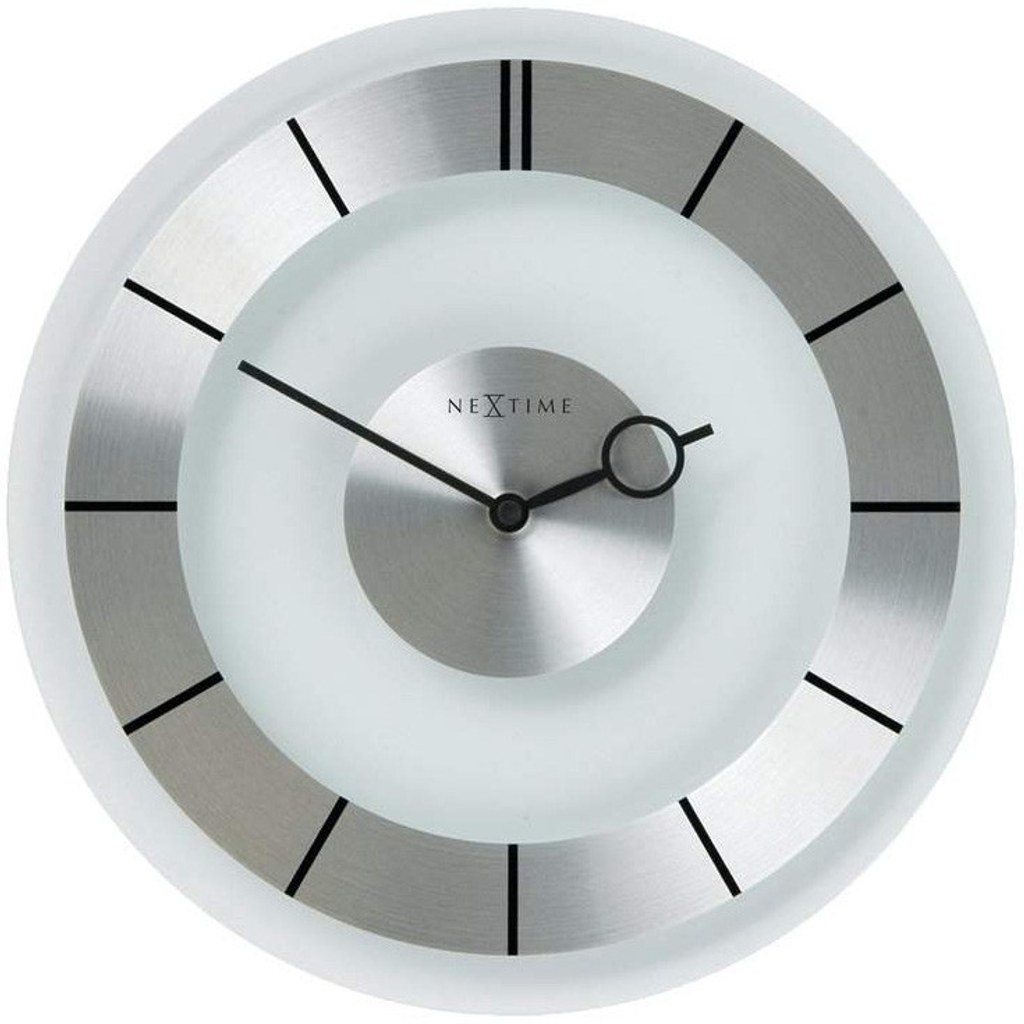 Skleněné hodiny s nerezovým číselníkem.