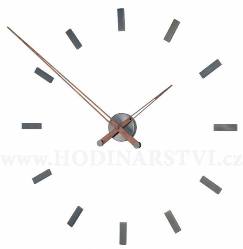 Technický popis: Průměr hodin - obvod minutové ručičky: 100cm - viz výkres ve fotogalerii. Poloměr velké ručičky: 50cm. Poloměr malé ručičky: 21cm. Rozměr hodin v 18:00: 71cm. Jednotlivé body číselníku měří 7x2cm a hluboké 1cm. Hodiny pohání kvalitní německý quartzový strojek UTS s plynulým a tichým chodem. Strojek pracuje na jednu baterii AA 1,5V Materiál hodin: Ciferník, závaží ručiček a 12 číselníkových hodinových bodů z kovu z exkluzivní povrchovou úpravou v grafitovém matu Ručičky jsou z tropického ořechového dřeva. Balení obsahuje šablonu pro snadnou a rychlou montáž indexů, v rozložení indexů jste však nezávislí a můžete využít svoji fantazii. Uvedený průměr je typizovaný, ale na instalaci libovolné velikosti průměru, vytvořeného kovovými indexy jste naprosto nezávislí.