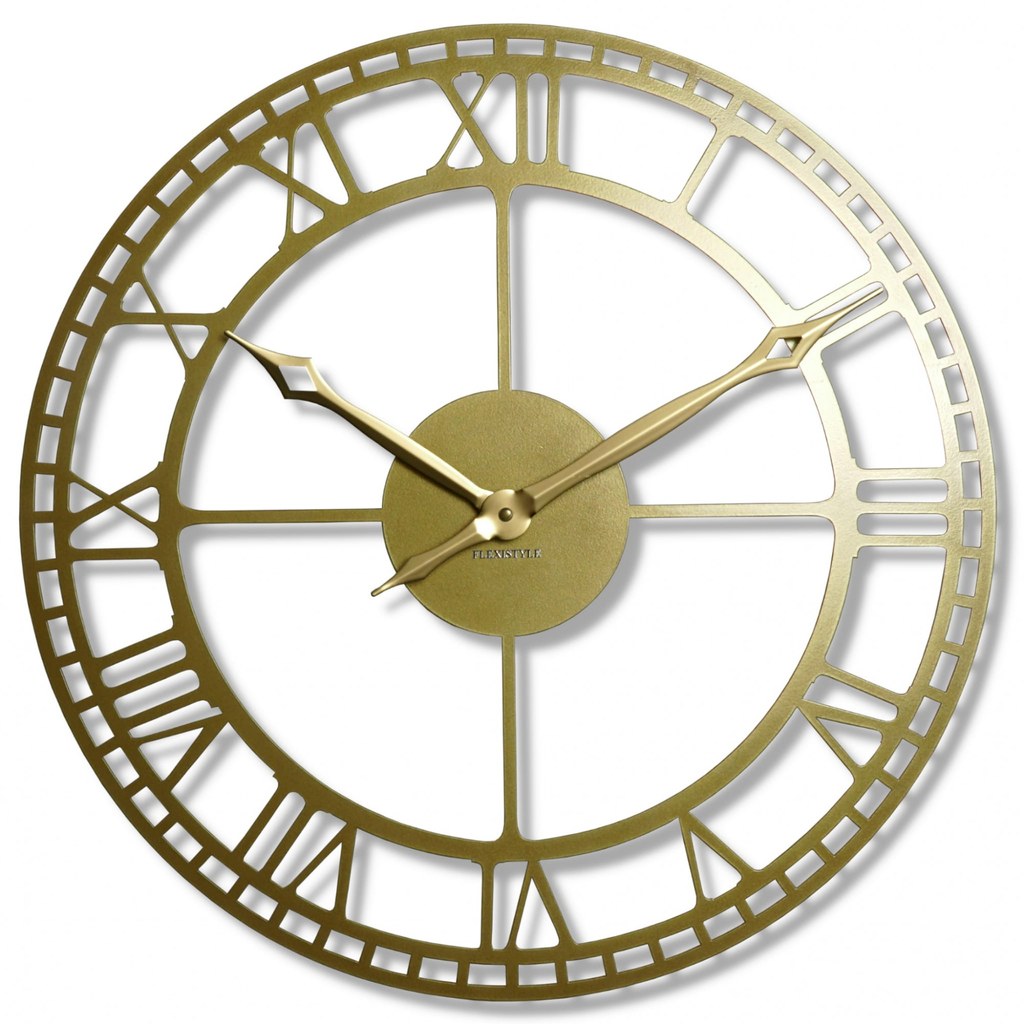 Jedinečné nástěnné hodiny v odstínu zlata. Jsou vyrobené z kovu a díky jejich velkému průměru (50 cm) jsou velmi dobře čitelné. Lze je zavěsit do velkých obývacích pokojů nebo jiných místností.