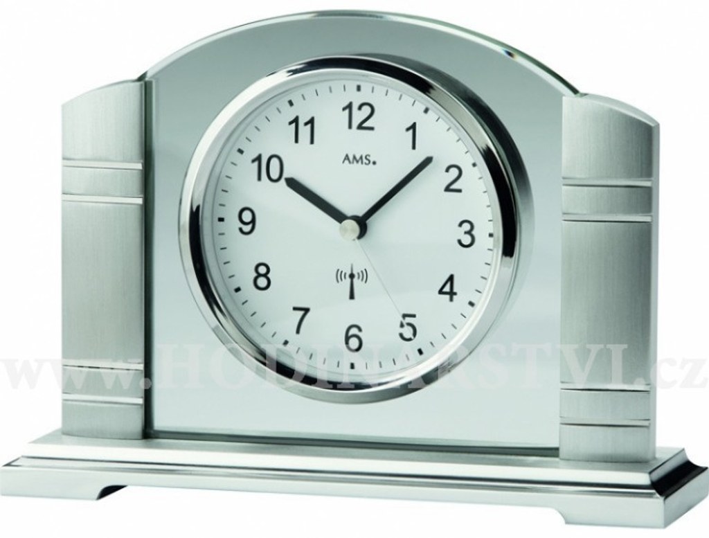Stolní designové hodiny AMS. Typ: řízené rádiovým signálem Barva: stříbrná Materiál: kov,sklo Rozměr: 19 x 14 x 6 cm