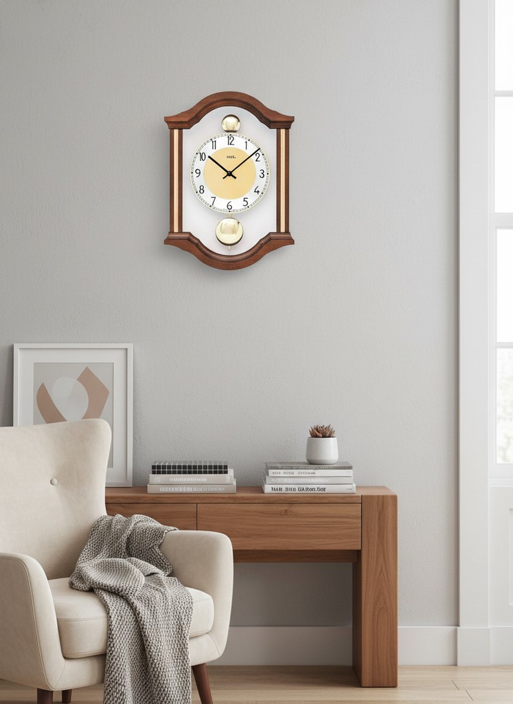 Nástěnné kyvadlové hodiny z masivního ořechového dřeva se 2 kyvadly (horní a dolní).