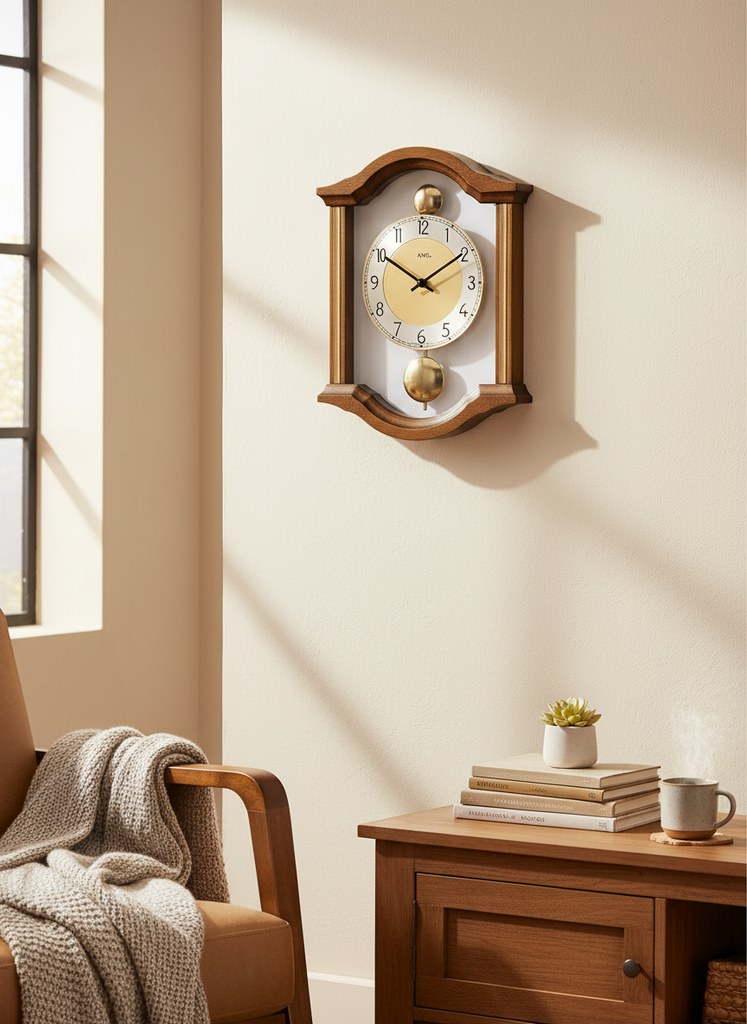 Nástěnné kyvadlové hodiny z masivního dubového dřeva se 2 kyvadly (horní a dolní).