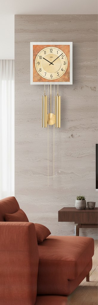 Kyvadlové hodiny, které jen tak běžně nevidíte! Tyto mechanické kyvadlové hodiny pohání dvě závaží a minimalistické kyvadlo. Krásné dvoutónové bití BIM-BAM je doplněno o perfektní design kamene - to jsou hodiny AMS 343!