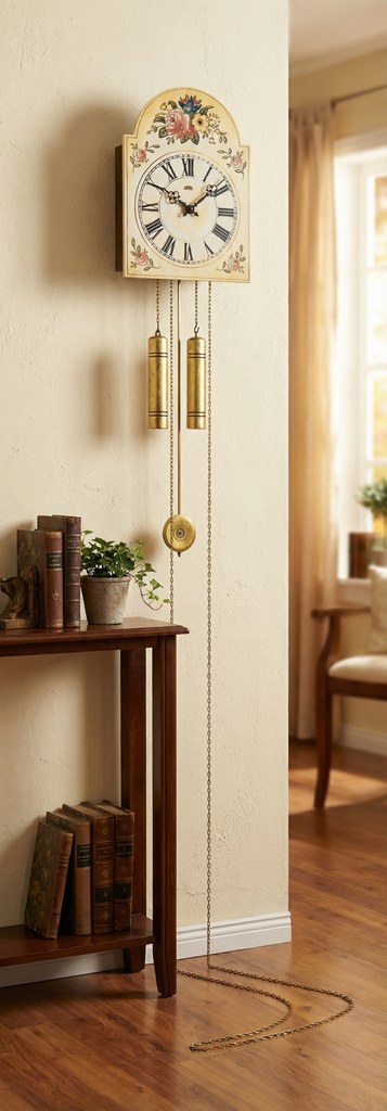 Luxusní mechanické kyvadlové hodiny Ručně malované Půlový stroj Bijí v půl 1x, v celou dle počtu hodin Natahují se 1x týdně Rozměr ciferníku: š:25 v:34 h:12 cm (měřeno bez kyvadla a závaží)