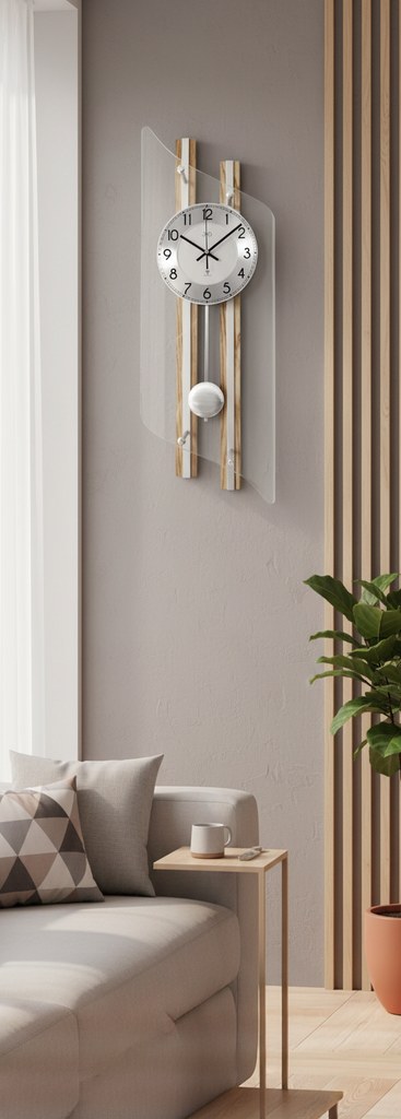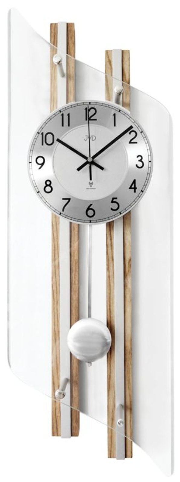 Moderní kyvadlové hodiny hodiny od české značky JVD vyrobené z kvalitních materiálů jako je dřevo, kov a sklo. Obrovskou předností těchto kyvadlových hodin je čas řízený signálem.