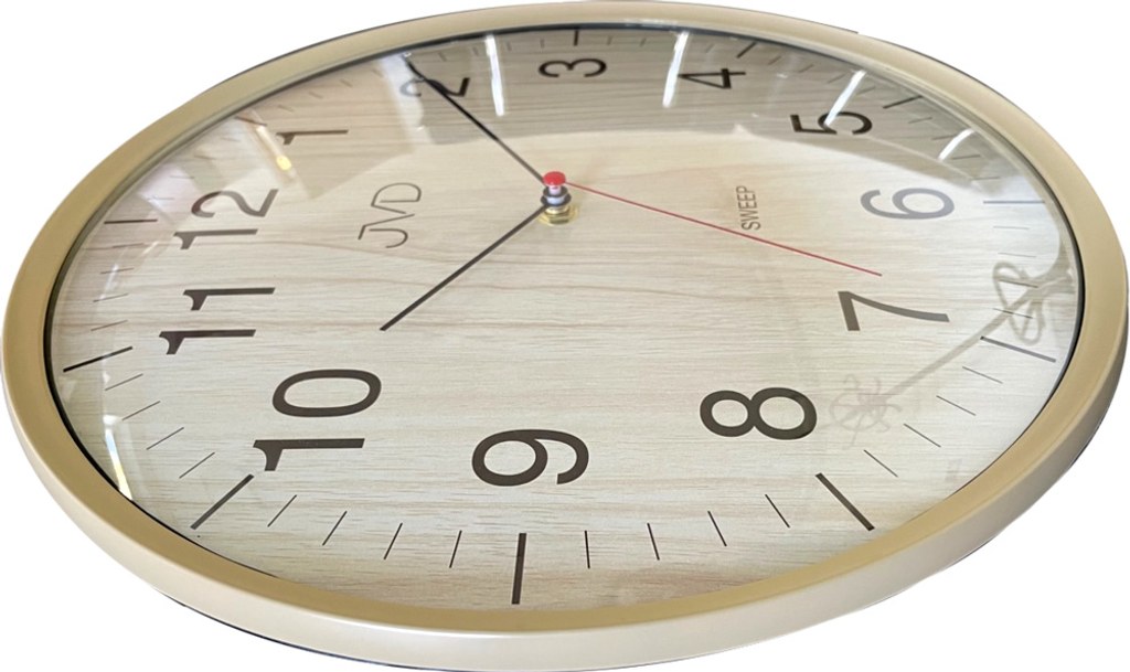 Plastové hodiny značky JVD, které zaujmou svou jednoduchostí, tichým chodem vteřinové ručičky a hezkou imitací dřeva na ciferníku. Materiál: Plast Plynulý chod vteřinové ručičky - hodiny netikají Bateriový pohon Velikost pouzdra: 33 x 33 x 3,5 cm