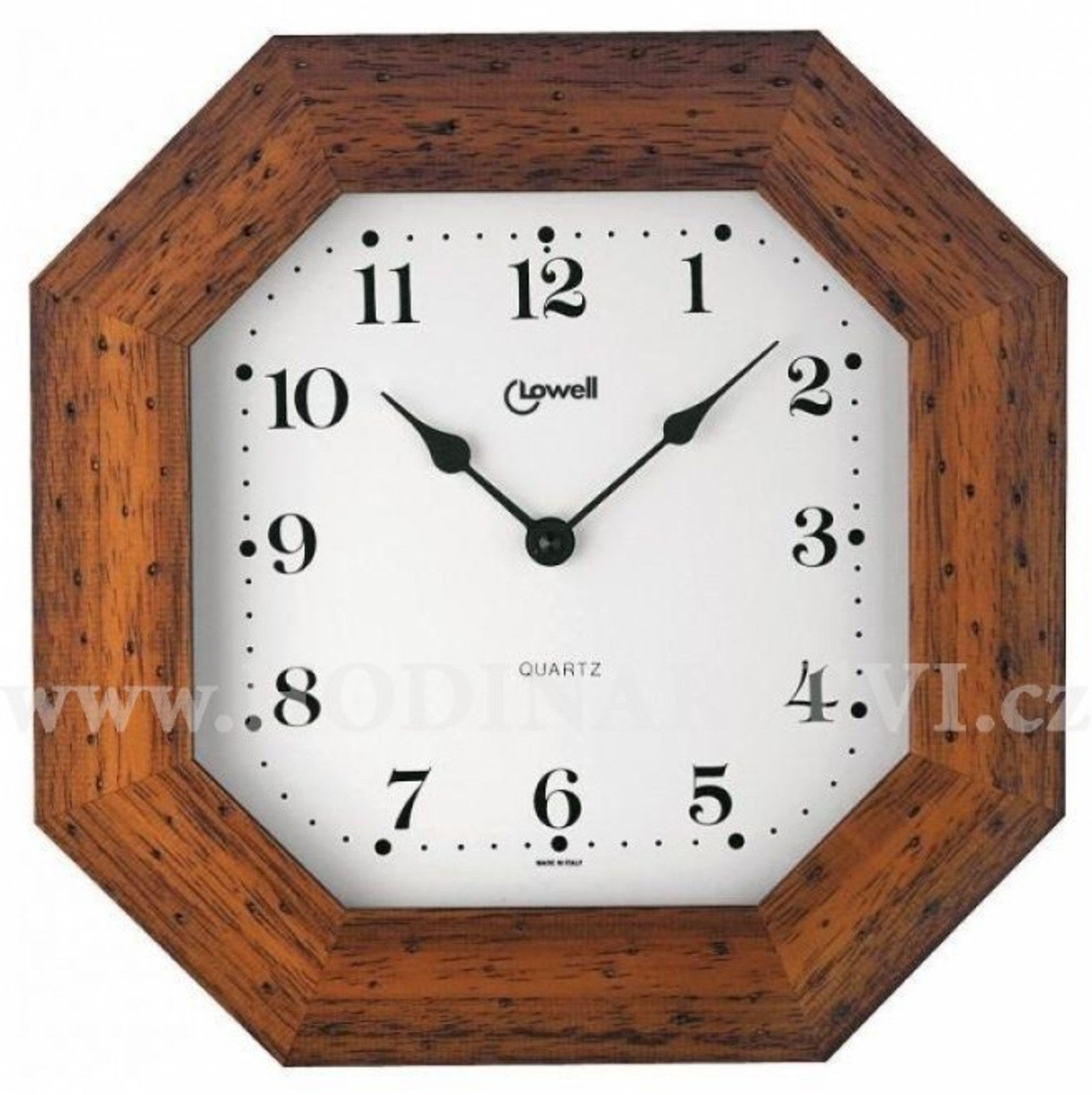 Moderní hodiny ve tvaru osmiúhelníku s originálním ořechovým rámem.