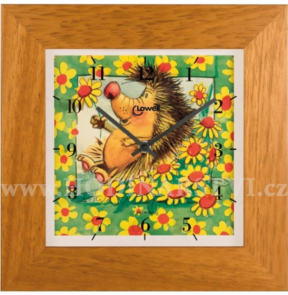 Moderní nástěnné hodiny s dětským motivem na ciferníku, které se hodí do dětským pokojů. Ciferník je olemován širokým dřevěným rámem.