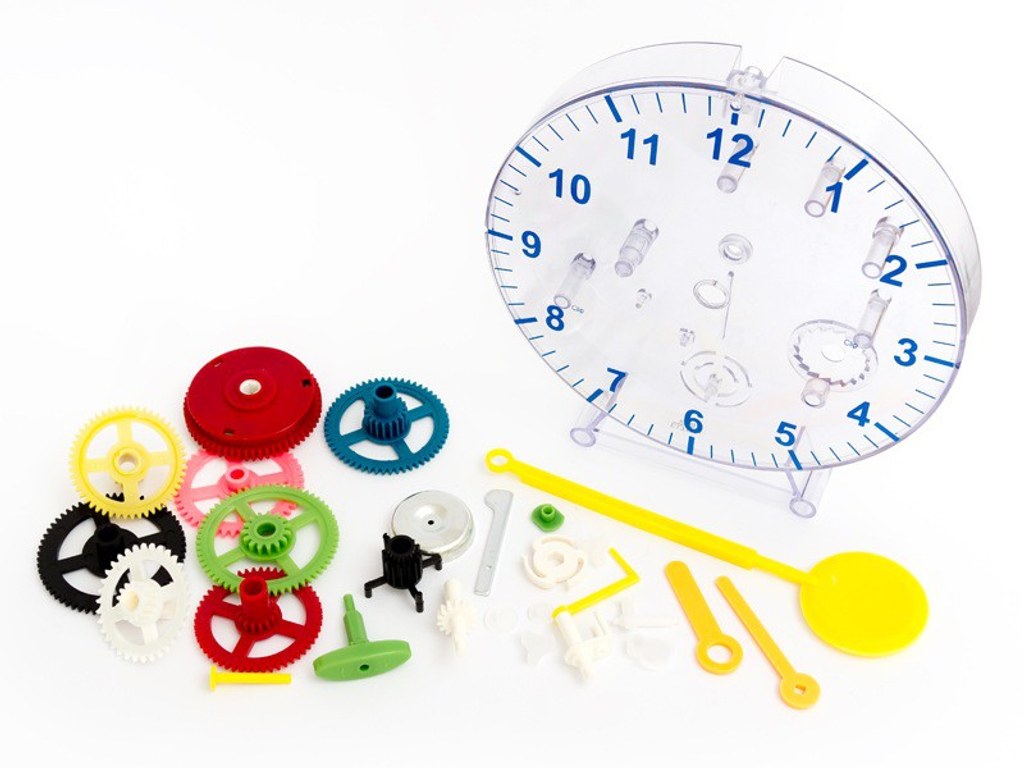 - 31 součástek - obrázkový návod pro sestavení hodin - mechanický systém s pružinou - každých 15 minut cinknou - transparentní pouzdro hodin - stojánek