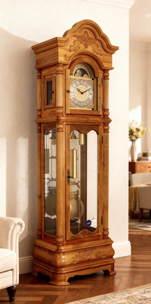Materiál: dřevo / dub Kvalitně zpracovaná skříň Půlový - závažový německý stroj Hermle V půl bijí 1x, v celou počet hodin 1x-12x Bití 2-tónové BIM-BAM Fáze měsíce Hodiny mají možnost vypínání bití