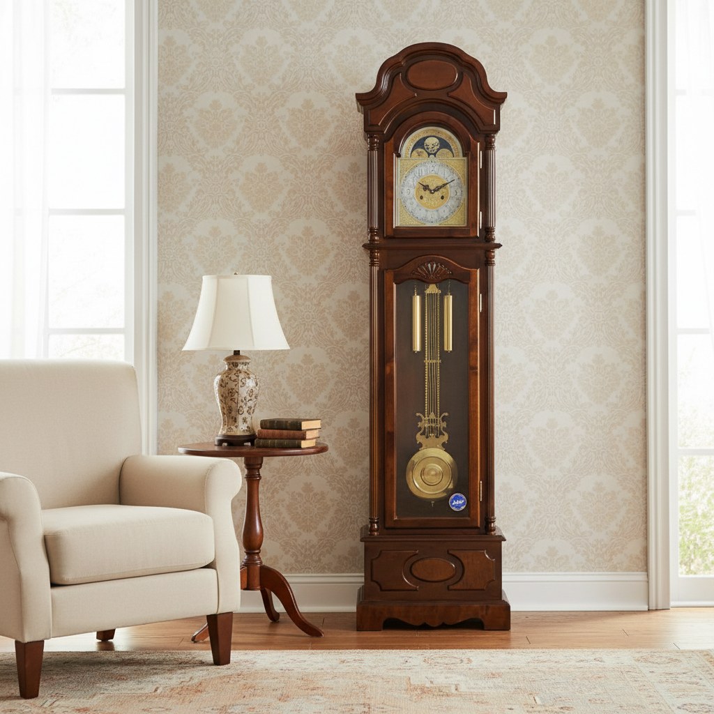 Materiál: dřevo / tmavý ořech Kvalitně zpracovaná skříň Půlový - pérový stroj V půl bijí 1x, v celou počet hodin 1x-12x Hodiny mají možnost vypínání bití š: 51 v:198 cm