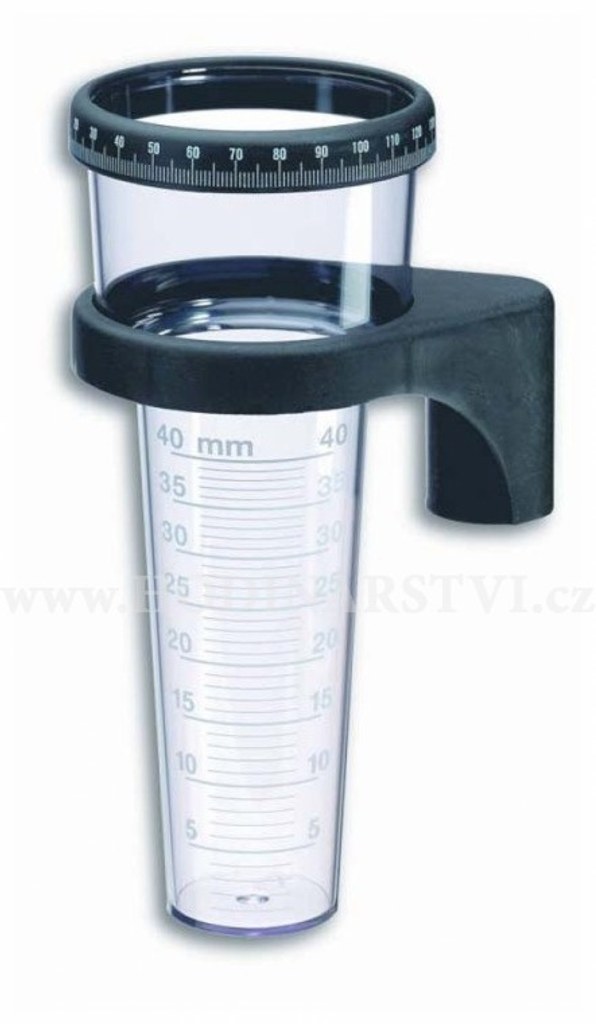 Plastová nádoba na měření množství srážek. Unikátní je otočný prstenec na horní hraně nádoby, kterým jednoduše přičítáte celkové srážky.