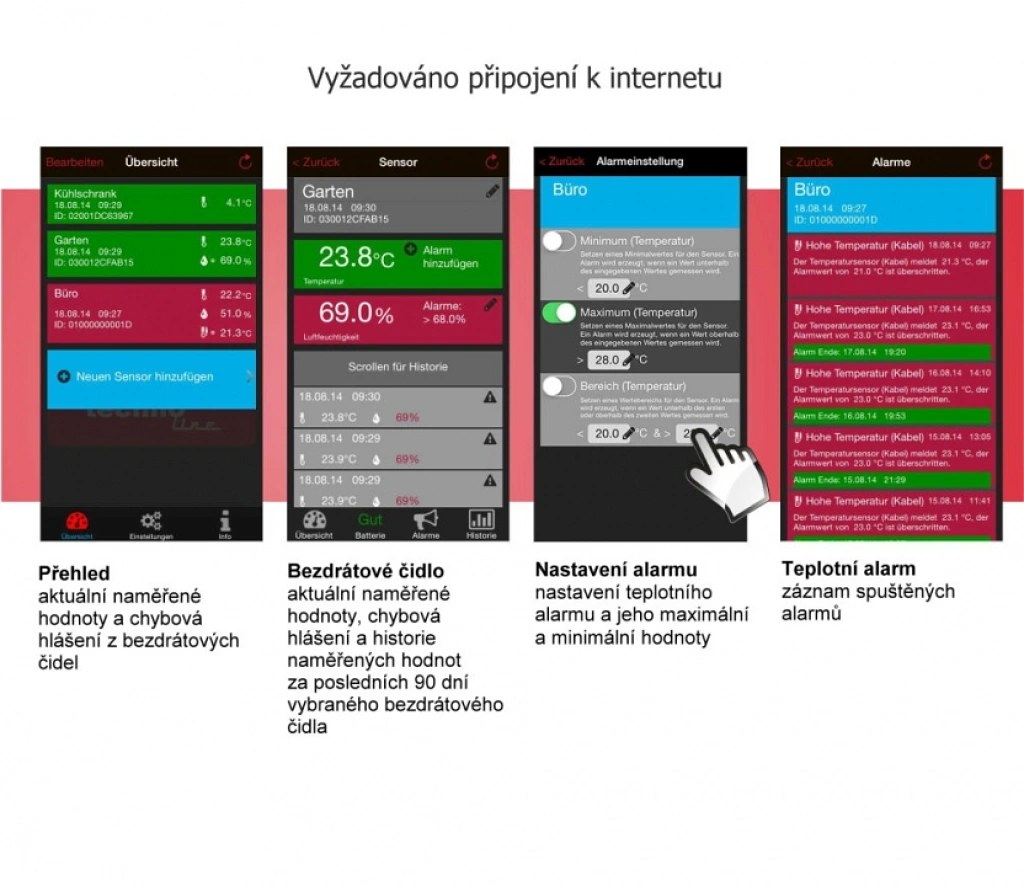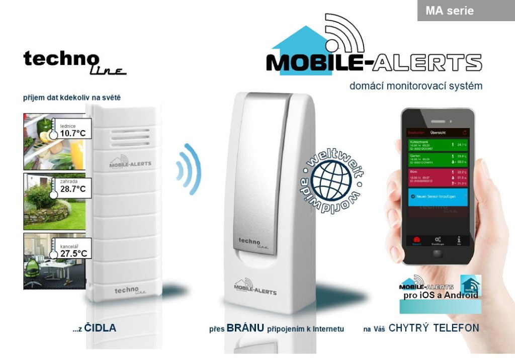 Tento domácí monitorovací systémTechnoline MOBILE-ALERTS využívá k zobrazování veškerých dat vaše mobilní zařízení pomocí Internetu (smartphone, tablet). Stáhněte si aplikaci MOBILE- ALERTS z příslušného zdroje v závislosti na operačním systému, které vaše zařízení používá (Android 3.2 a novější - z Google Play, iOS 7 a novější - z Apple App Store). Tato startovací sada obsahuje bezdrátové čidlo pro měření teploty a bránu, která se připojí pomocí LAN kabelu s routerem pro přenos dat na Internet. Kdekoliv na světě ja potom možné po připojení k Internetu na Vašem mobilním zařízení sledovat naměřená data.