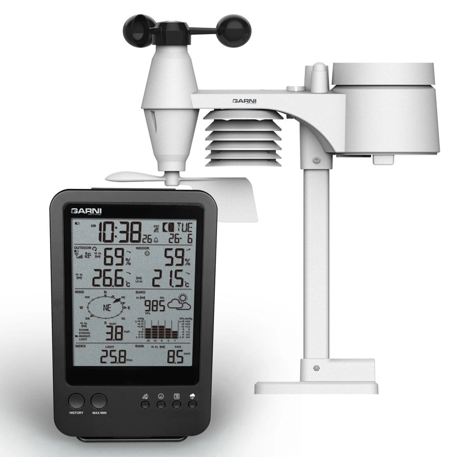 Meteorologická stanice s předpovědí počasí, měřením vnitřní a vnější teploty, relativní vlhkosti, barometrického tlaku, rychlosti a směru větru, dešťových srážek, UV indexu a intenzity slunečního záření