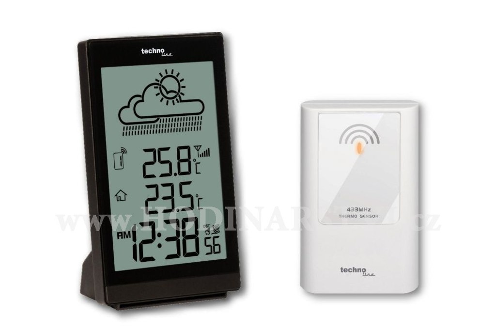 - metorologická stanice Technoline - velikost displeje hlavní jednotky 68 x 104 mm - velikost číslic - čas 20 mm, teplota 15 mm - displej je možné osvětlit krátkodobě modrou barvou na 5 sekund - 4 animované ikony předpovědi počasí (slunečno, mírně zataženo, oblačno, deštivo) - předpověď počasí na základě vývoje barometrického tlaku - zobrazení hodnot vnitřní a vnější teploty - zobrazení teploty ve °C, nebo °F - bezdrátový přenos hodnot vnější teploty na frekvenci 433 MHz - dosah signálu bezdrátového čidla až 50 m v otevřeném prostoru - ikona příjmu signálu bezdrátového čidla - paměti na maximální a minimální naměřené hodnoty vnitřní a vnější teploty a relativní vlhkosti - čas řízený rádiovým signálem DCF-77 - ikona příjmu signálu DCF-77 - možnost manuálního nastavení času - časová zóna (-23 hodin, +23 hodin) - indikace možnosti náledí při vnější teplotě od -2°C do +3°C - ikona indikace slabých baterií bezdrátového čidla - 12ti, nebo 24 hodinový formát zobrazení času - možnost postavení