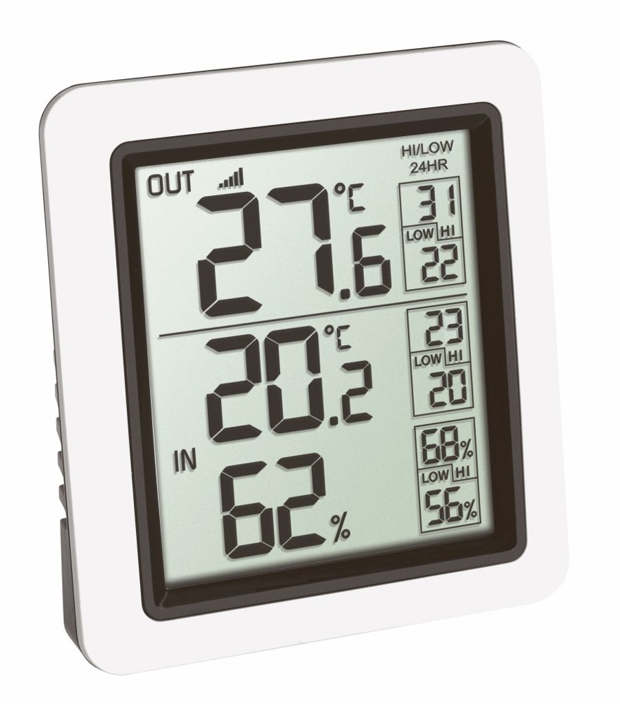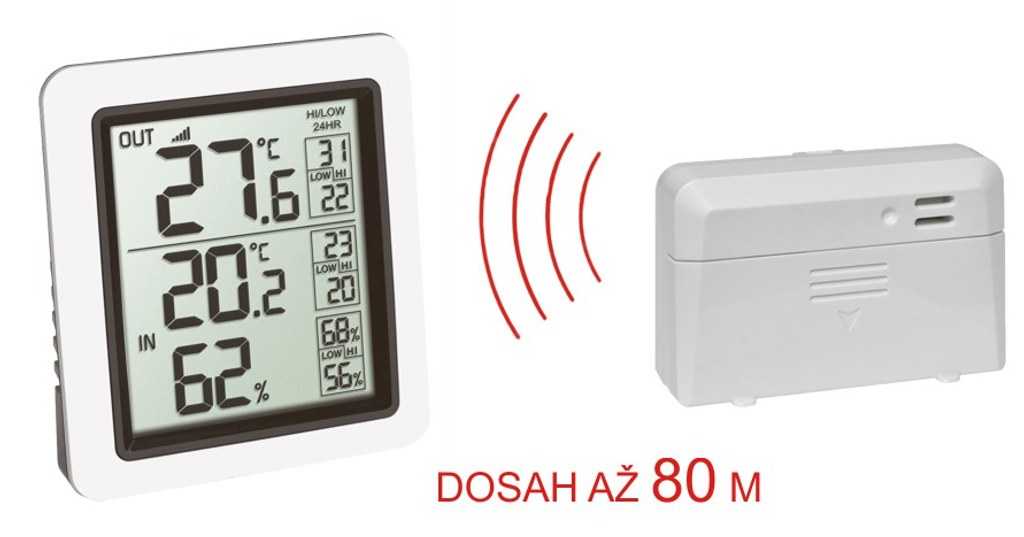 Přístroj bezdrátově komunikuje s vysílačem teploty až na vzdálenost 80 m v otevřeném prostoru. Na displeji můžete sledovat kromě venkovní teploty také vnitřní teplotu, vnitřní vlhkost a také maximální a minimální hodnoty všech měřených veličin - není tedy nutné přepínat tlačítky pro zjištění maxim či minim. Na přístroji je možné nastavit automatické resetování maximálních a minimálních hodnot každých 24 hodin nebo tyto záznamy můžete vyresetovat ručně.