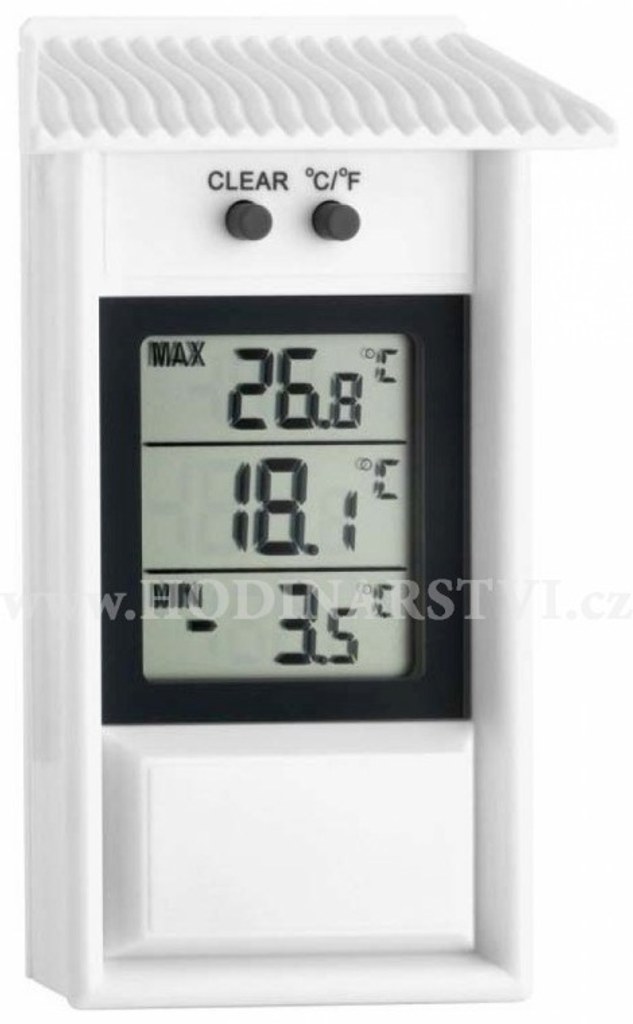 Digitální teploměr zaznamenávající naměřené minimální a maximální teploty. Teplotu lze zobrazit ve °C, nebo °F. Naměřená minima a maxima lze manuálně vynulovat. Teploměr je odolný vůči povětrnostním vlivům a lze jej použít jak ve vnitřních, tak ve venkovních prostorách. Provedení bílý plast.