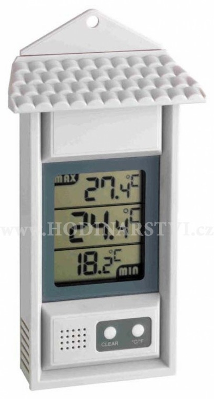 Digitální teploměr zaznamenávající naměřené minimální a maximální teploty. Teplotu lze zobrazit ve °C, nebo °F. Naměřená minima a maxima lze manuálně vynulovat. Teploměr je odolný vůči povětrnostním vlivům a lze jej použít i ve venkovních prostorách. Provedení bílý plast.