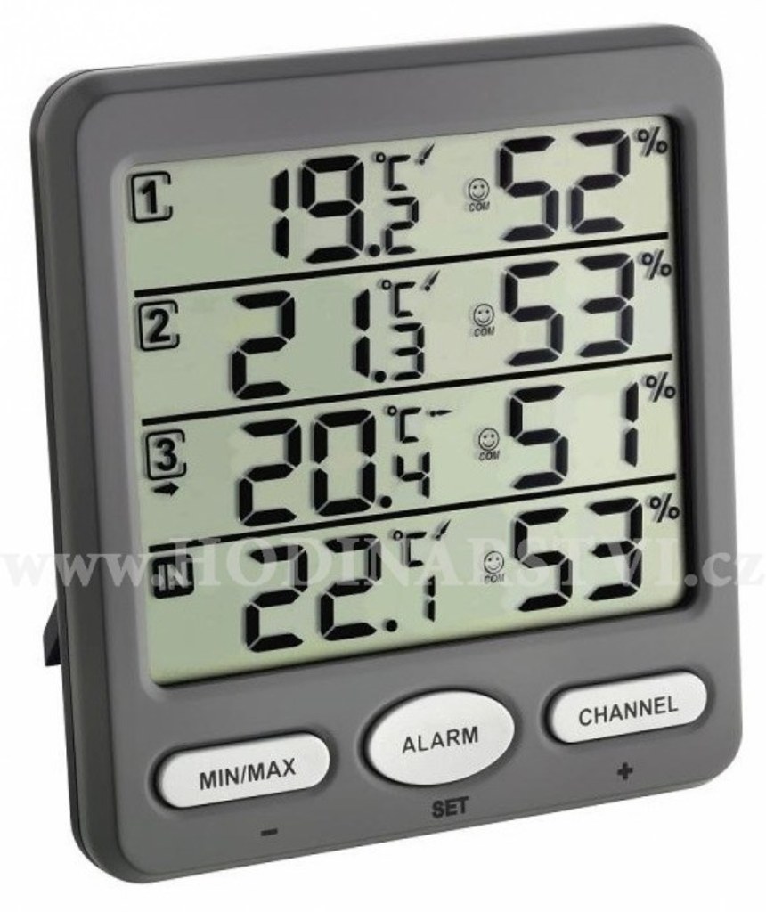 Součástí přístroje jsou již v základní výbavě 3 čidla, další (TFA 30.3208.02) se dají přikoupit. Přístroj nadále disponuje funkcemi jako je paměť na minimální/maximální naměřené veličiny, symbolová indikace vlhkostní pohody (sucho, komfort, vlhko) a vývoje teploty (klesá, stoupá, nemění se) či individuálně nastavitelné teplotní a vlhkostní alarmy pro libovolné čidlo včetně interních senzorů v základně. Speciální funkcí je pak možnost dokalibrace teploty či vlhkosti u libovolného čidla.